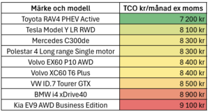 Tesla Model Y, Polestar 4, Volvo EX60, BMW i4 och Volkswagen ID.7 Tourer landar mellan 8000 och 9000 kronor per månad beroende på version. Elbilarnas styrka är framför allt de låga driftkostnaderna: drivmedlet är betydligt billigare än för motsvarande bensin- eller dieselbil, och servicebehovet är begränsat. För Tesla sker service dessutom endast vid behov, vilket bidrar till den låga ägandekostnaden. Volvo EX60 står för svensk ingenjörskonst i framkant och förväntas få mycket starkt andrahandsvärde.